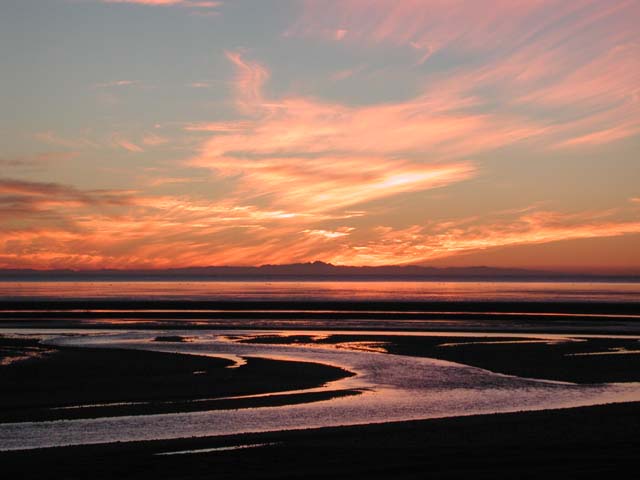 The wind was good to us that evening. Near 1 am, Kai turned on his headlights to see the extent of the tide's inflow. We could hear the water rushing through the tidal flat rivers. But, being on the bluff, it could not be easily seen. Kai and Dan walked down the bluff for a closer look. I stayed in the sleeping bag and Kathleen, as usual, slept through the whole thing.