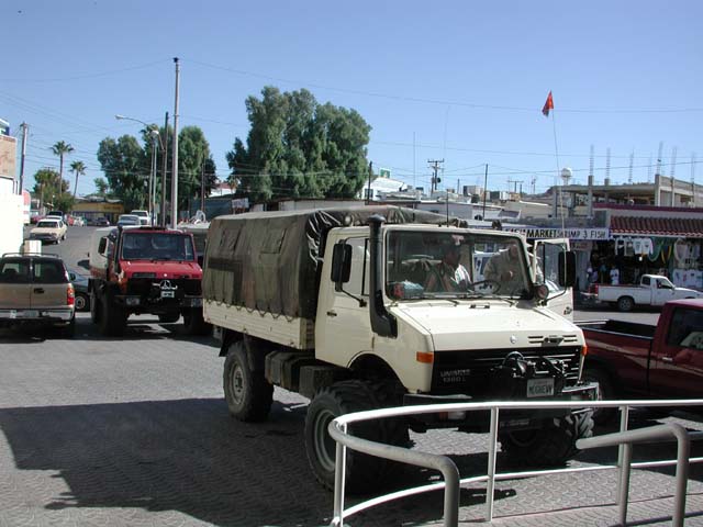 After we tired of watching the tire dudes sweat, we headed into town for some breakfast. We were herded into the parking lot by some fellows at Flavio's Restaurant once they saw the trucks approaching. The place was clean, had clean restrooms and good food. Seems that the presence of the mogs caused quite a stir. And, it attracted additional patrons as well. Once the staff determined that the mogs were drawing business, the free stuff started flowing - appetizers, beer, shots, etc. Below, on of the patrons queries me about the 1300, he can be seen in the driver's seat. Generating good will for all of mogdom. We ate and ate and ate. I was totally stuffed. Still, they wanted us to stay and generate more business. But, we needed to shop for seafood and get diesel, so we left.