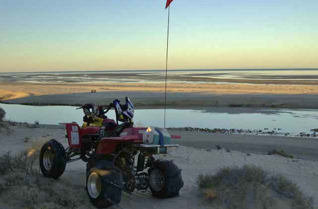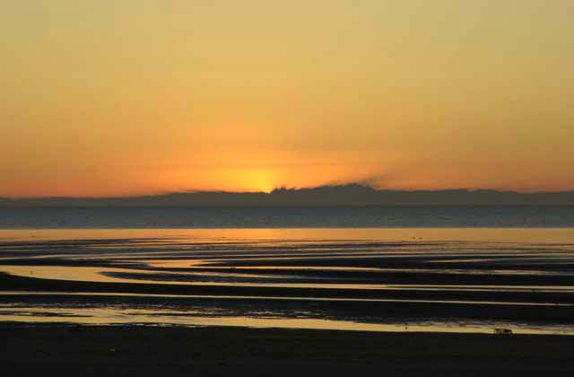 Once the shopping was completed, we headed back to the same spot on the bluff. The view was good, the wind was light and we proceeded to totally pig out on the clams and shrimp. While not as spectacular as the previous night, the sunset was still respectable as the sun sinks below the Sierra Juarez on the Baja Peninsula. Note the tidal flats and the rivers of water waiting to trap trucks.