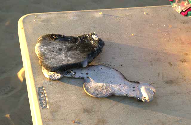 The plan for the day was to break camp, and then head into Puerto Penasco for supplies. There we would get diesel, beer, ice, camarones, almejas, and breakfast. During the morning cleanup, we discovered the remnants of the engine block fire the night before. While less than spectacular, the light was intense and I am sure could be seen from miles away if there was someone looking, which there was not.