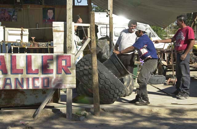 We headed back to the railroad and took the dirt track directly in to Puerto Penasco. We stopped at the first llanteria (tire fixit place) that we saw and gave them Dan's tire. Below, it can be seen on the ground with the tire team looking at it probably saying "what the f**k is that".