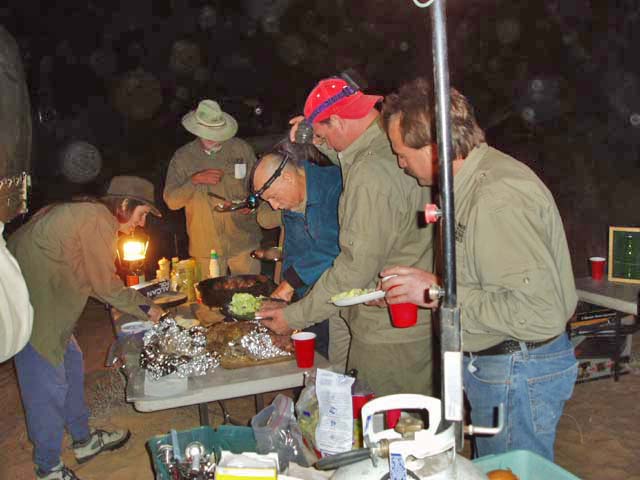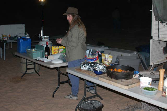 The extrication went off easily with minimal drama except the obvious. And happily, the tires reseated without having to take them off the truck, saving a bunch of sweat and time. All the tire work caused us to get to camp late. Like the last trip, and the trip before that. We looked for a proper site, but there were no really good ones available. Finally, in the waning light of sunset, we settled for "acceptable" rather than perfect, and setup for our dinner of Prime Rib, potatoes, corn and cherry cobbler. Below, Kathleen prepares one of the Dutch ovens and sets up the table service.