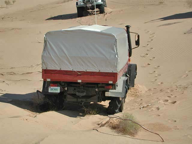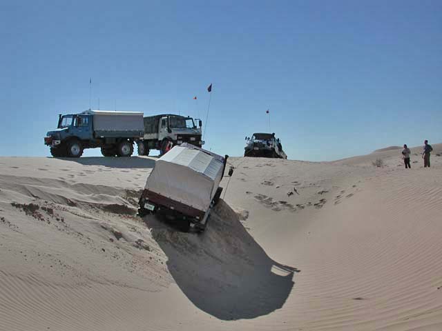 It did not take long before the problems started. Dan was the first stuck. As you can see from the tracks, he side slid down the soft sand and was unable to counter steer. I am guessing that he did not have his differential locks engaged. Diff-locks always help on soft side hills. While they do not insure your ability to cross a side hill, it greatly raises the chance that you will succeed. In this case we decided to tow Dan rather than letting him continue to dig and suffer. Note the depth of the tires in the sand. He plowed a big furrow before he finally got stuck.