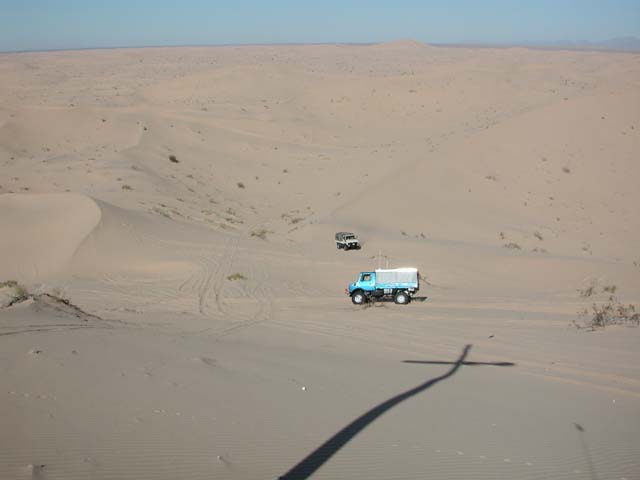 Below, you can see the scope of the bowl. Kathleen took this shot from partially across the bowl, looking back toward the trucks. The trucks are dwarfed by the size of the dunes.