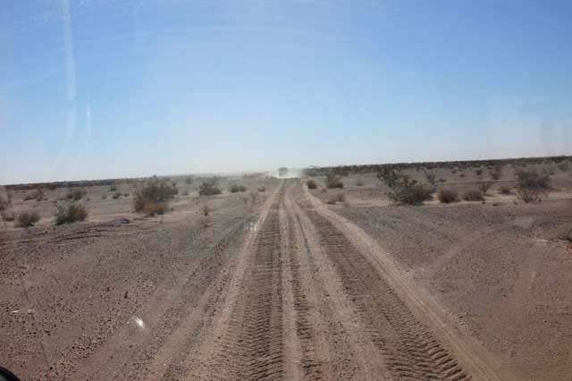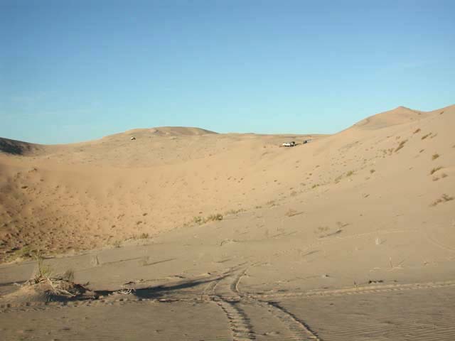 Once the group was aired down and had beers in hand, we headed down the entry road to the start of the dunes. This road is flat, featureless, dusty and straight. Below, Mark is ahead of me and I am holding far back to keep from eating the fine dust that is pervasive in this part of the country. We are generally heading to the south-south east from Cesars. Note the tire tracks that the XM-47s leave in the soft dirt of the trail.