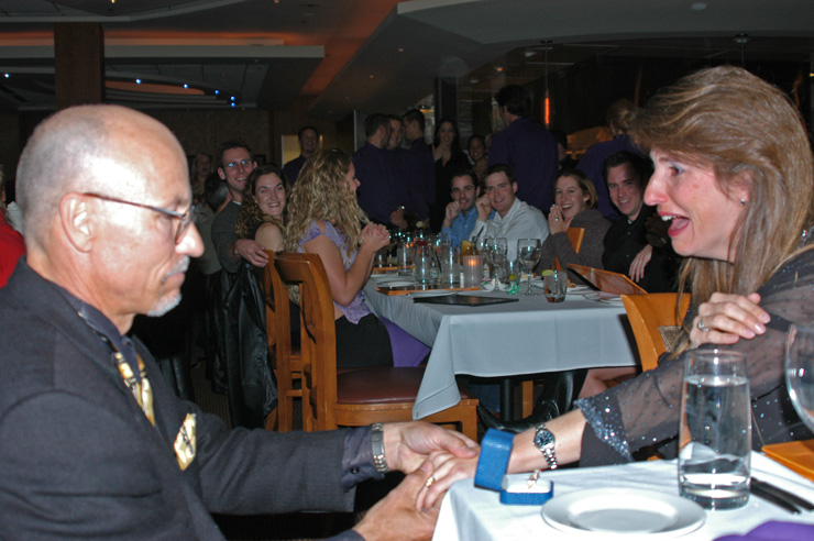 The lines that I used to good effect are listed below. The proposal was delivered at about 830pm on Friday 12-12-2003 at Roy's of La Jolla in front of perhaps 100 folks. There was not a dry eye in the house when I was done. The specific speech is: