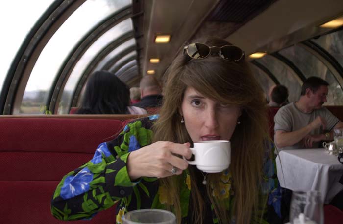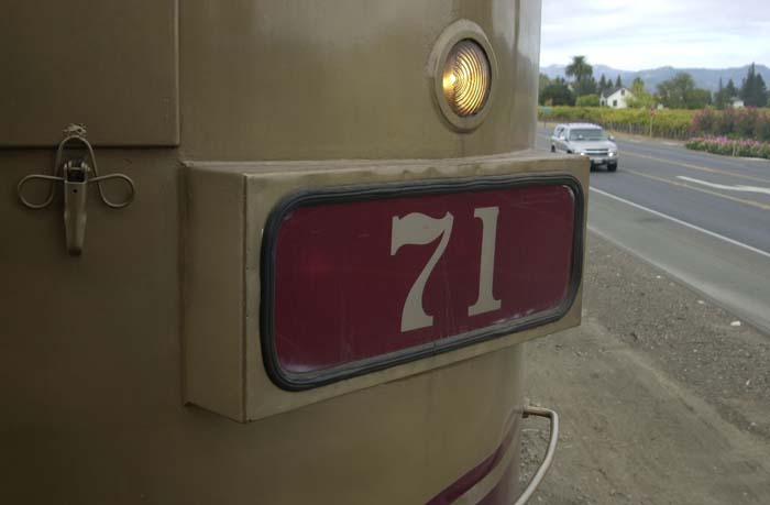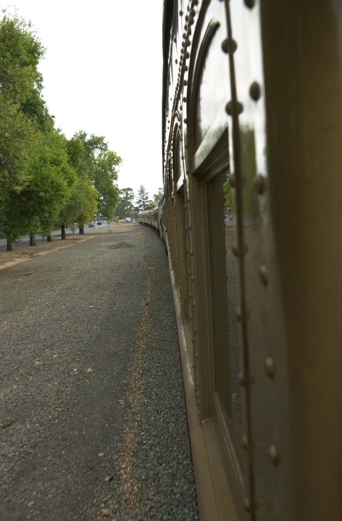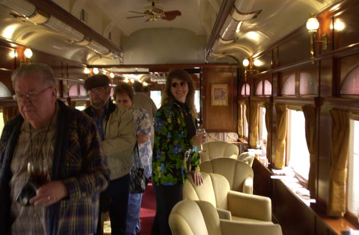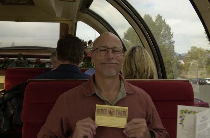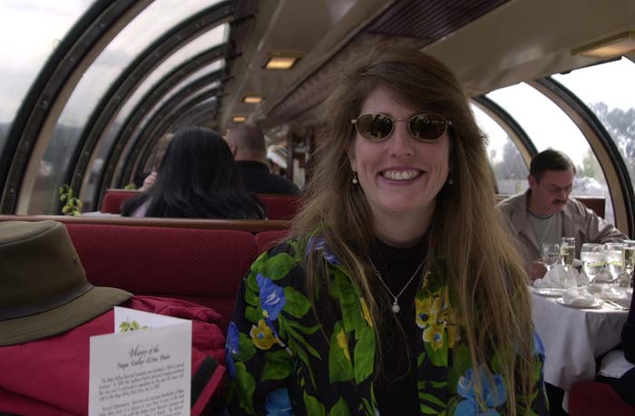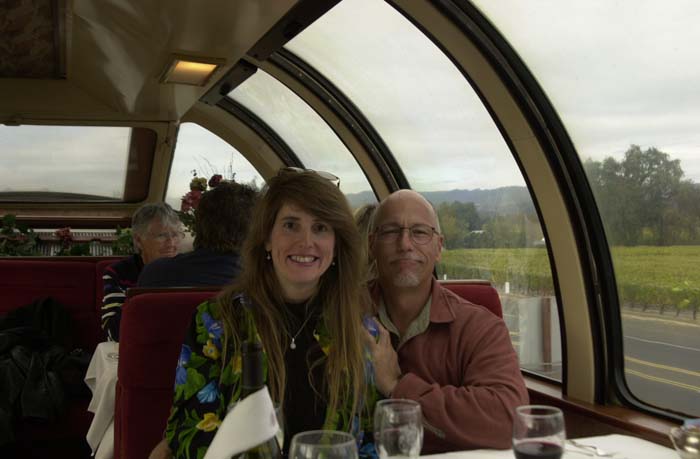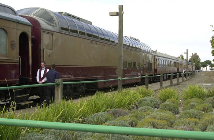 The wine train is a restored loco and pullman cars. The deluxe service is in the vista dome car with the windows. That is where Kathleen got tickets.