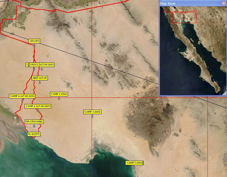 On this trip, unlike the last time, I got a good estimate of mileage. The total dune travel was 160 miles. Total fuel usage for my 1300 was about 1 1/2 tank or about 55 gallons border to border. Remarkably, and unlike previous trips, there was diesel in El Gulfo. On the two previous trips, El Gulfo was out of diesel so I counted myself as lucky. Figure 5 below shows an overlay of our waypoints on the satellite photo. This figure has waypoints from several trips, but this will give you an idea of the area that was traversed by the team. In the top right of the photo is the global view of Baja for a better perspective.