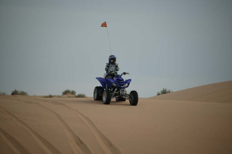 Nancy going for a post breakfast ride on Dan's soon to be wrecked quad.