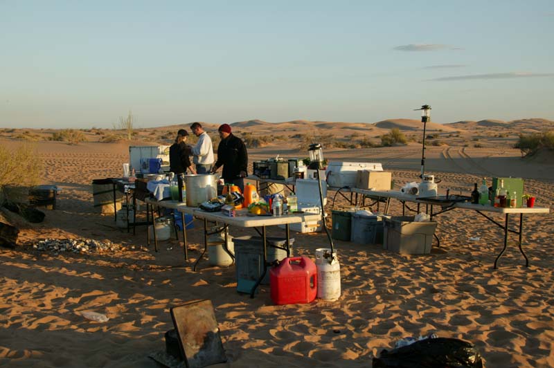 The trip back to San Diego was both boring and terrifying. It was boring in that there were no further events. Mark Mitchell went ahead on his own. Rob Pickering left the group and headed east back to Denver, although his group elected to spend the night in Yuma due to exhaustion. Caid, Serrano, Clark, Johnson and Espinosa elected to do a banzai run back to their homes in San Diego. After a brief stop for a burger in El Centro, we hit the road. Exhaustion became the demon to fight as we struggled to stay awake after a long, arduous day. As we approached El Cajon an eastern suburb of San Diego, Dan Johnson fell asleep at the wheel. I succeeded in awaking him with the radio. He fell asleep again at the intersection of I8 and I805 and failed to respond to my frantic calls on the radio and missed the correct turnoff. Panicking, I accelerated around him on the right. I had already committed to the exit ramp, but managed to jump over a berm to get back on I8 westbound. I planned to pull around in front of him and let him hit me from behind so I could slow him. I hoped that the force of the impact would awaken him and prevent him from impacting anything along the roadside. I succeeded in aborting the exit ramp and did a 3 foot jump with the truck at full freeway speed; I got in front of him still frantically shouting on the radio. No response. As we passed him, Kathleen reported that he had fully checked out. Remember, Dan has injured ribs and had taken medication for the pain. For whatever reason, he maintained control of the vehicle and followed me down an off ramp and to Kai's house. I still as of the date of this writing, have not closed the loop with him to determine what happened. I am guessing that his radio went off frequency and that is why he did not respond. That said, he was checked out when we passed him. At this point it does not matter. What does matter is that nobody else was hurt and no equipment was damaged. The Altar got it's pound of flesh (and many pounds of rubber) on this trip.