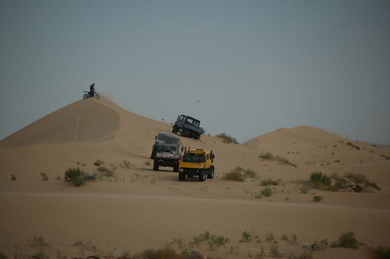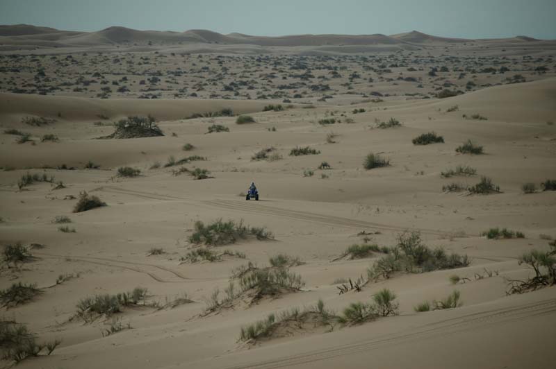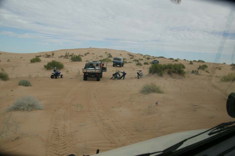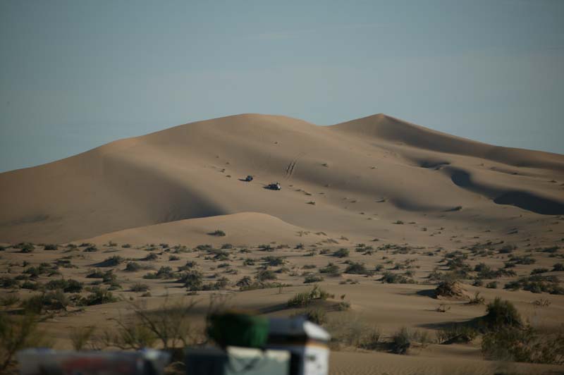 After breakfast was complete and most of the rigs were packed for the final trip to the border, we sent a team out to get Dan's wrecked quad. He rolled on the flank of one of the biggest dunes in the area. Below, you can see the crew as they return from the recovery site.