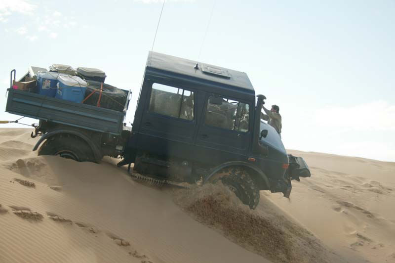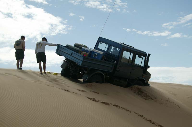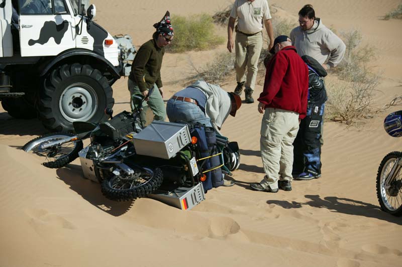 Jay dumps his bike again. His bike is heavy and the soft sand makes it a challenge to maneuver. I am guessing that the fatigue is becoming a major factor as we were forced to travel a substantial distance on the fourth day. Below, Jay gets up to right the bike.