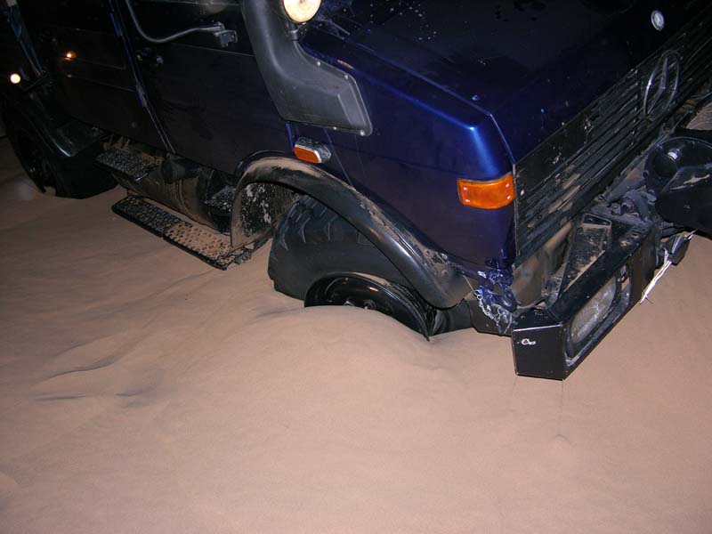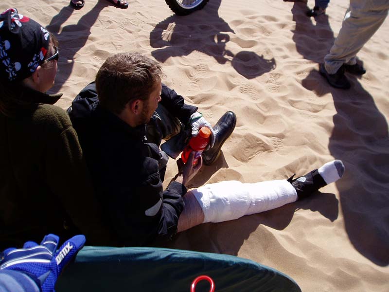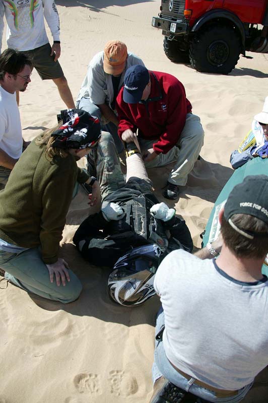 Nancy provides a back rest for Jay so he has something to lean against as we prepare him for evacuation in Pickering's truck. While Jay was being splinted, the balance of the team loaded his bike into Rob's truck. Jay is in significant pain and is not happy about what will happen next. Act two is 6 hours bouncing around in the back of a DOKA as we traverse the balance of the dunes and make a run for the border. Mark Mitchell give Jay some pain reliever, thus easing the trip back.