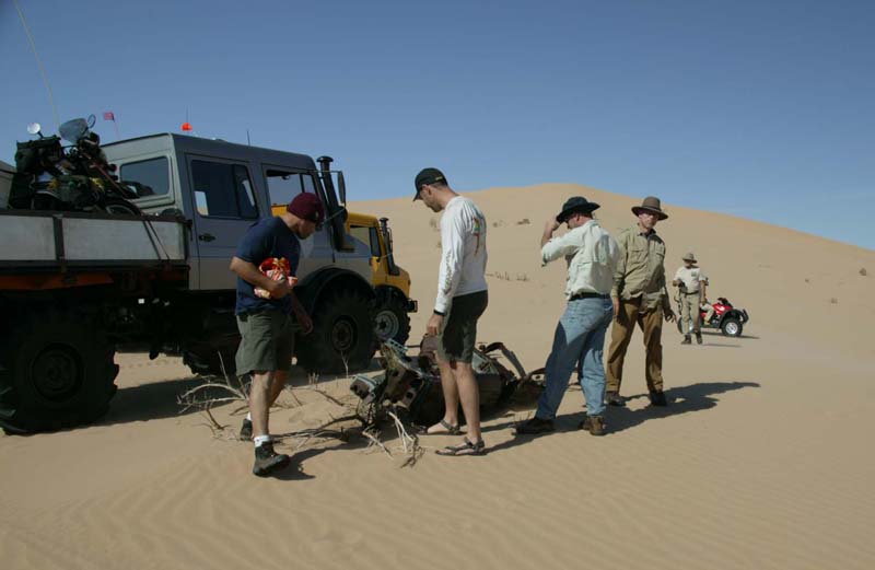 The team gets to the south side of the cross and encounters a big group of four wheelers from San Luis. While we discuss our circumstance concerning Jay with them, they told us that over the years, they have had 7 fatalities in their club out on the Altar. Below, several team members examine parts of an abandoned vehicle rusting in the desert wind.