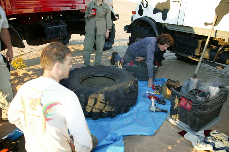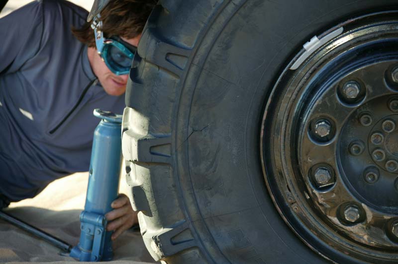 The Altar was not quite done with us yet. After the tires on Dan's truck were reseated, and we were ready to go, one of the team noted on the radio that his back right looked "low". True enough as it had a big rip in the sidewall as can be seen below. This required us to get the tire off the rim and install a patch, then reseat the tire. Tons 'o work. And it was getting dark. The wind was starting to blow, requiring Matt to use goggles while jacking the truck.