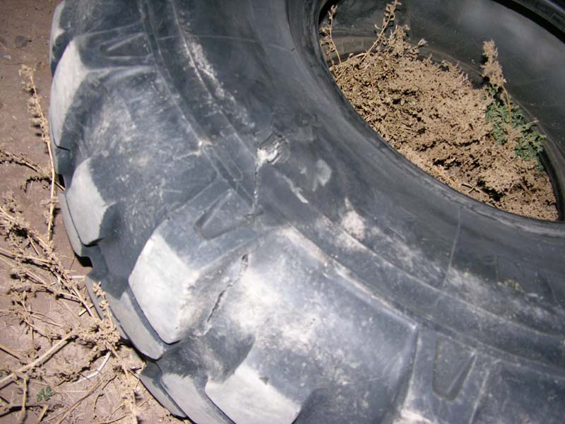 We got to the blacktop without further incident and got through the Mexican military checkpoint without too much trauma. We had good luck at the border this time, the wait was minimal. They did, however, want to put each of us through secondary inspection to look around the interior of the cargo beds. But, the Altar was not fully done with us. As we left Yuma, Dan called on the radio and stated that the tire that we patched on the 2450 blew out at full freeway speed. We mustered the troops to determine the repair strategy. At this point, it was about 10pm and we were all very tired. 6 de-beads in one day was way, way too much. As we assessed the situation, we realized that what we had to do was to take a spare from Dave Clark's 1300, remove it from the rim and put it on the 2450. We would have just used the spare as-is, but the rims are different even though the tire sizes are the same. The tires on the 2450 were .85 aspect ratio and therefore "taller" than the normal spares that any of us had available, thus necessitating the switcheroo and a ton of work in the dark, cold roadside along Interstate 8 outside of El Centro. Below, you can see the rip in the tire as a result of the blowout.