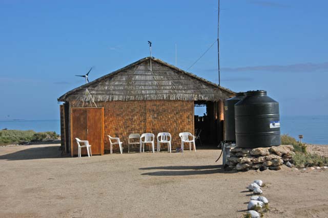 The cook shack with wind generator and radio mast.