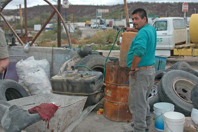 We went to the Pemex for diesel and Kai reported over the radio that his fuel tank was leaking. Since we were planning to head back into the desert, it was mandatory that we got the tank fixed, otherwise he could run out of fuel. So, Kai headed to the Taller Mechanico (mechanic shop) to get the tank welded. While we were there, the balance of the group went into the little Pueblo of San Ignacio to shop and check out the sights. While we were at the mechanic getting the tank fixed, Dan called over the radio to state that Katie had fallen from the bandstand in the plaza and had broken her arm. Being an orthopedic surgeon, he had examined her and determined that she needed X-rays to determine the scope of the injury and then some kind of cast or fixation. The clinic in San Ignacio was ill equipped to handle this situation and definitely did not have an X-ray machine. The locals suggested that we go to the nearest big town, Santa Rosalia, as they had a hospital. Santa Rosalia was another 100 km down the road to the south.