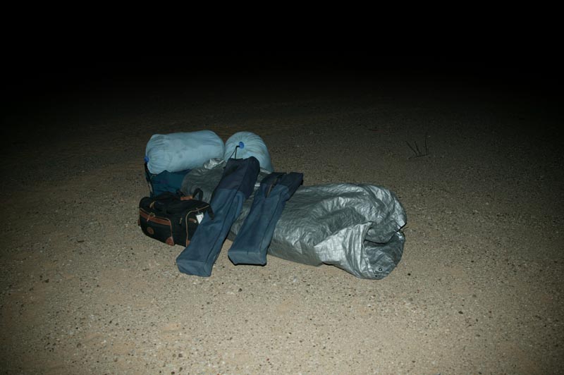 It was late, so we all set up "camp". Storm clouds were threatening, so we decide to put down a tarp to sleep on. Good thing as the rain started in a few minutes. Below, you can see the very spartan camping setup.