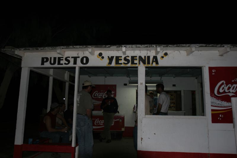We headed east following the trans-Mexico railroad, then south on the road to El Gulfo. Going was slow since the roads were narrow and there was lots of traffic. Finally, we hit an army drug control checkpoint, aka Puesto Yesenia. At the point, there was a taco stand. Being hungry, and given that it was 9pm and that we had at least another hour of dirt to even be able to think about cooking, we elected to eat at the stand. The meat was quite tough (carne duro), but it was still tasty and the group ate 40 of them.