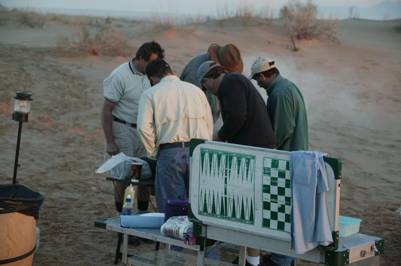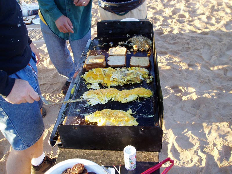 The primary mission was to get breakfast cooked. Below, the team prepares "breakfast with a bang"..