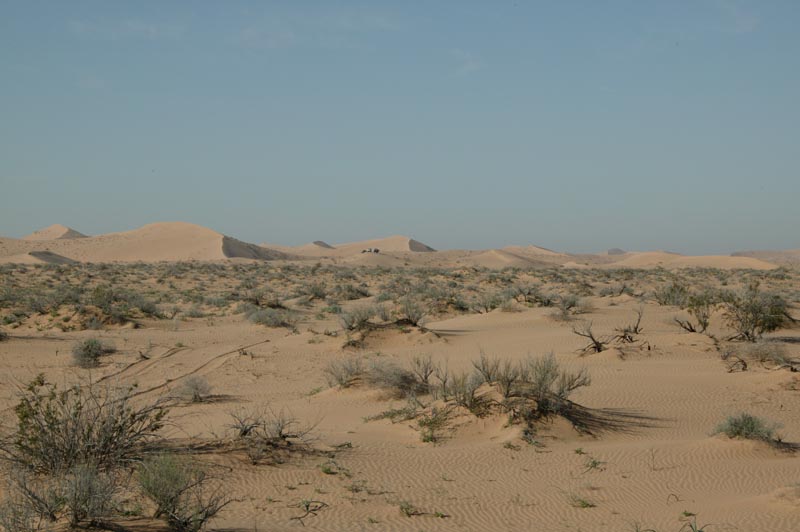 The team is waiting for me on the first ridge out of the tundra. The big trucks are small specks in a sea of sand.