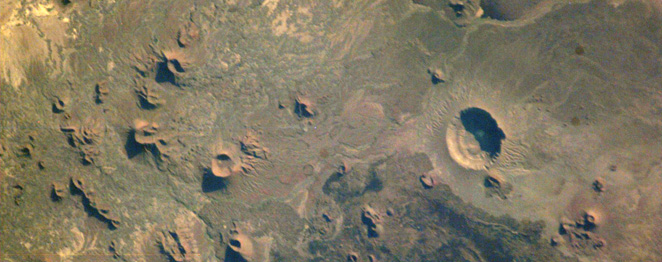 Early in May 2004, the new Space Station crew (ISS-9) obtained high-resolution images of the Pinacates, allowing for detailed observations of the surface features. One example is a large volcanic crater (see box, and detail below) called Crater Elegante which is one of the most prominent and interesting features of the Pinacates. For scale, the diameter of the crater is approximately 1500 meters.