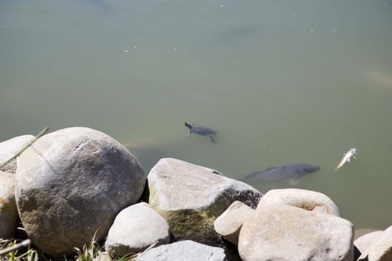 A turtle and a koi check out a dead pond-mate. They had been feeding on the carcass earlier. Yuck.