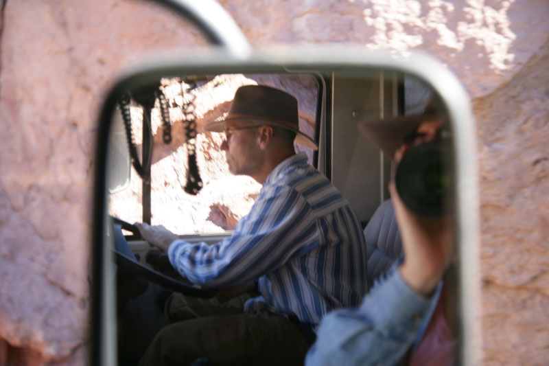 Despite the fact that the boulder was mostly out of the way, we still had to drive around it over a steep bank. Here, Kathleen attempts to navigate around the rock.