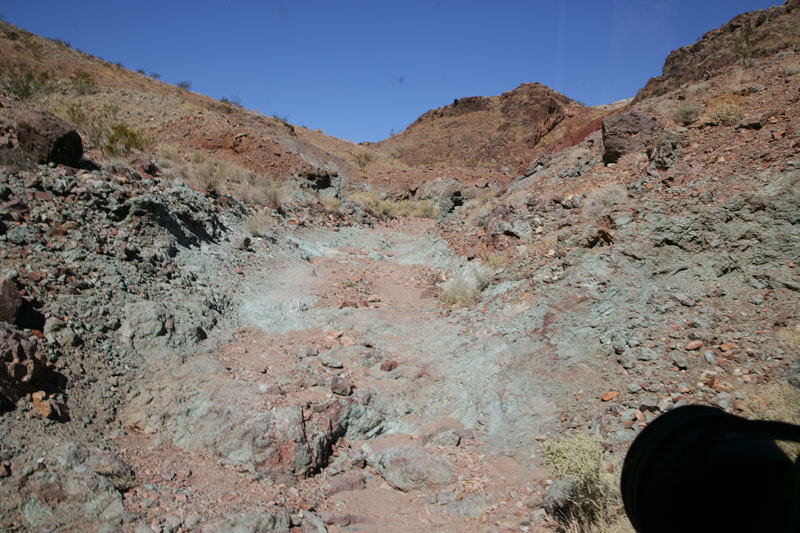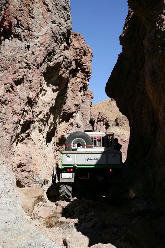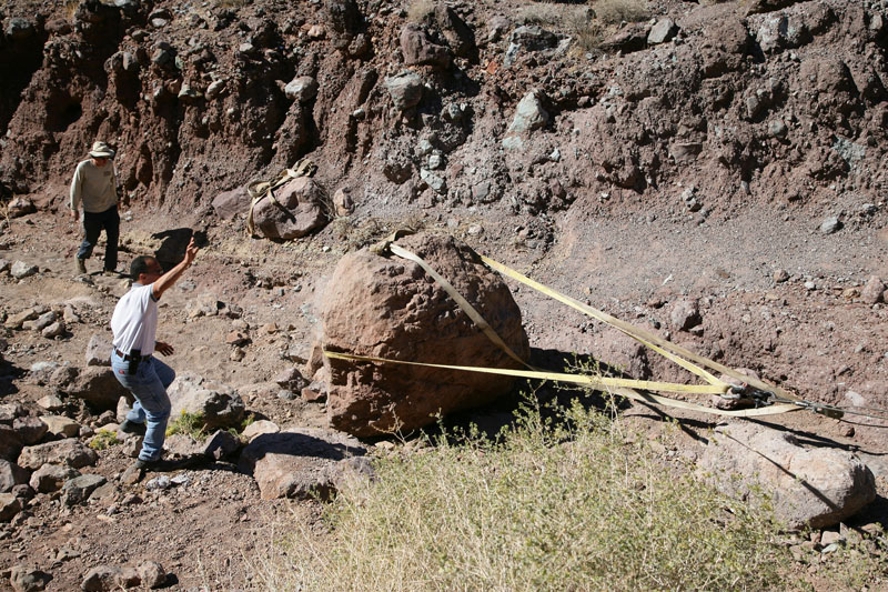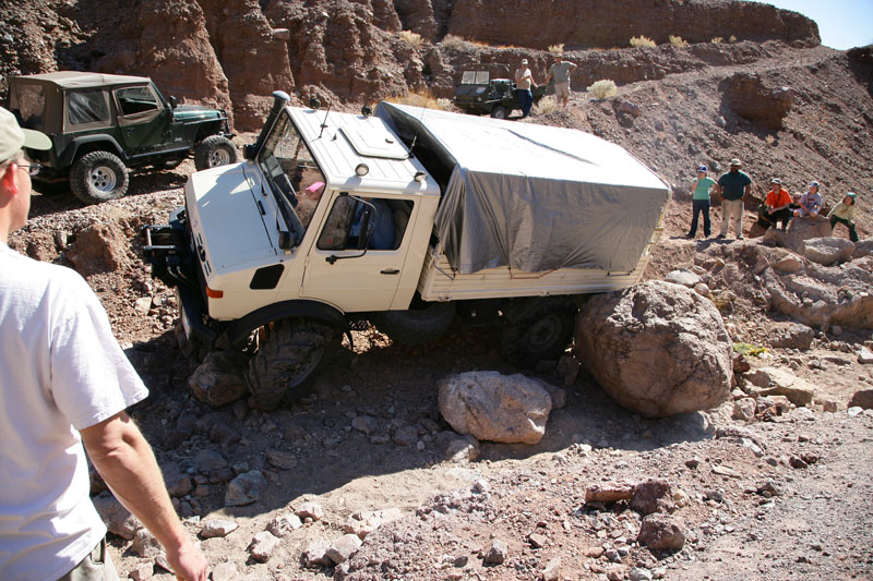 Our progres was blocked by this big boulder that fell into the center of the trail as a result of winter rains last year. The crew uses the winches on several of the trucks to drag it out of the way. This was a big effort that spanned the better part of an hour.