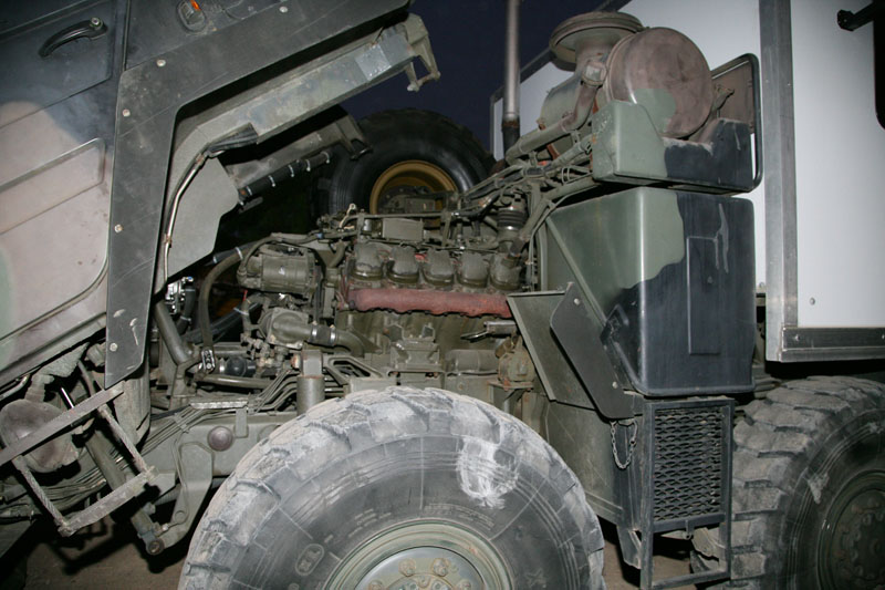 Here is a good shot of the MAN with the cab in the service position. This thing is a beast that weighs 50,000 pounds. You can judge the size of this truck from the height of the person examining the engine.