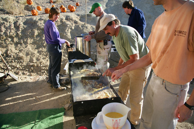 Kai and the cook team made machaca, eggs, tortillas and beans for breakfast. In the rear of the photo are the pumpkins left over from the previous night's carving contest.