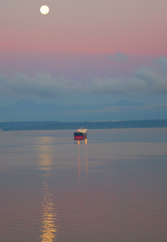 I got up pretty early the morning of our departure. When I got to the back window, I saw that sunrise was happening as a full moon was setting in the west over the Olympic Mountains.