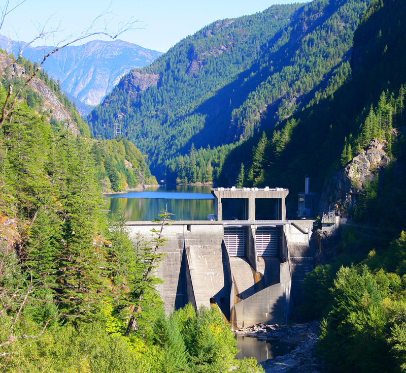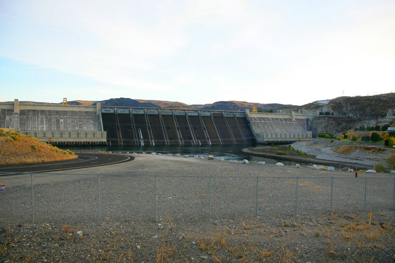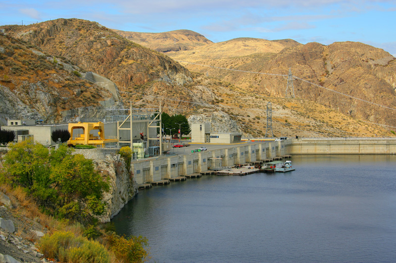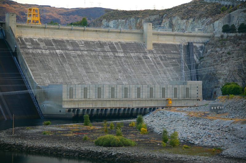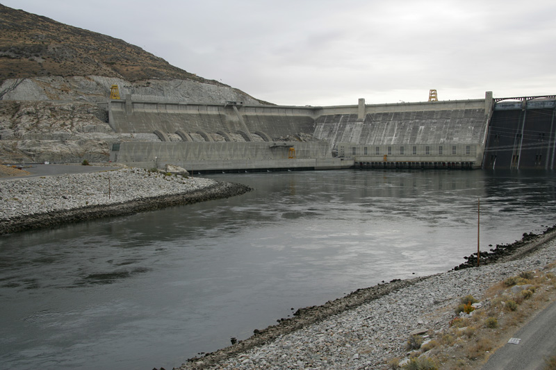 The right side of the dam. The right power house is the rectangular structure at the bottom of the dam. The cable runs on the right up the dam face provides power for the pump house complex that is just visible on the right, above the top of the dam. There are 6 turbines in the power house and the power output of 2 of the turbines are fully utilized powering the pumps.