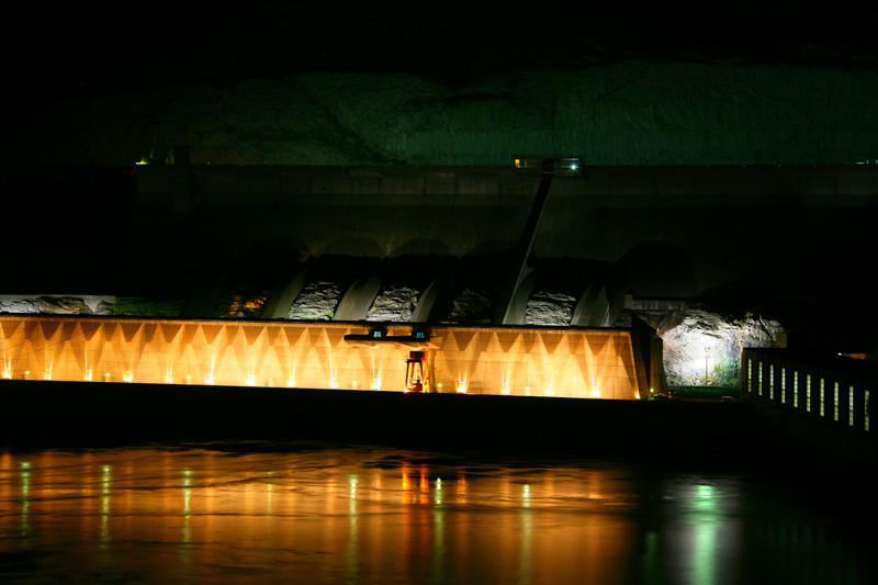 The number 3 powerhouse after dark. The penstocks are visible on the rock face.