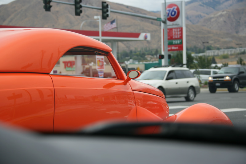 On the return trip we passed through Wenatchee where they were having car show as part of the Wings and Wheels Festival. We attempted to attend, but all the cars had departed since it was late in the day. We passed this hot rod on the road. Check out the reflection in the paint job. This was a fine, fine ride.