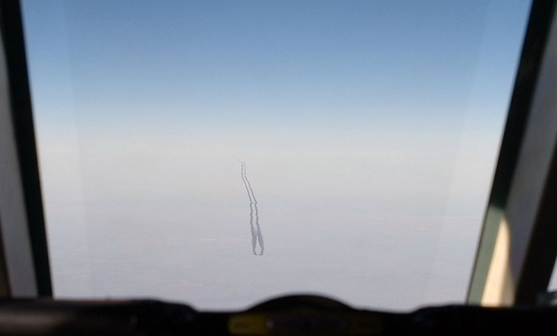 Our trip to NY was planned on very short notice and therefore by boss offered me a ride on his Falcon 50 jet. While returning to Seattle, I caught this photo of an oncomming jet several thousand feet below us. Note the contrails from each of the engines. We estimated the closing speed to be over 1,000 miles an hour.