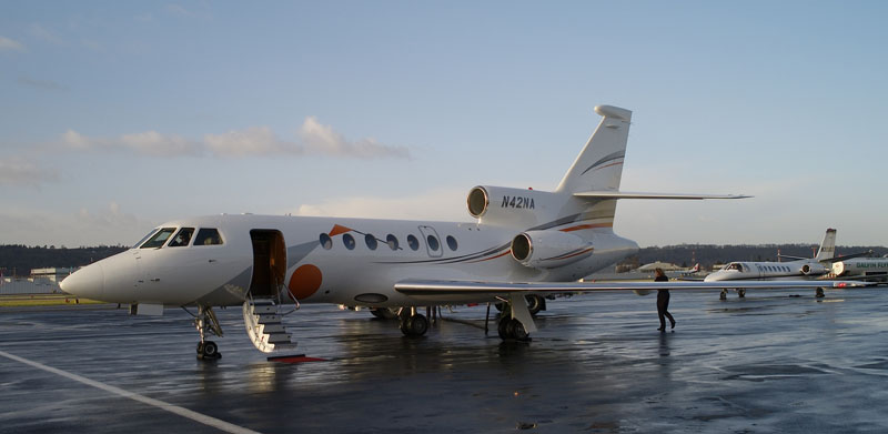 This is my boss's Falcon 50 after its cosmetic make-over. Note the new paint job and the vanity tail number. His son's company is called Fortuna and the tail number is 42NA. This is one fine ride.