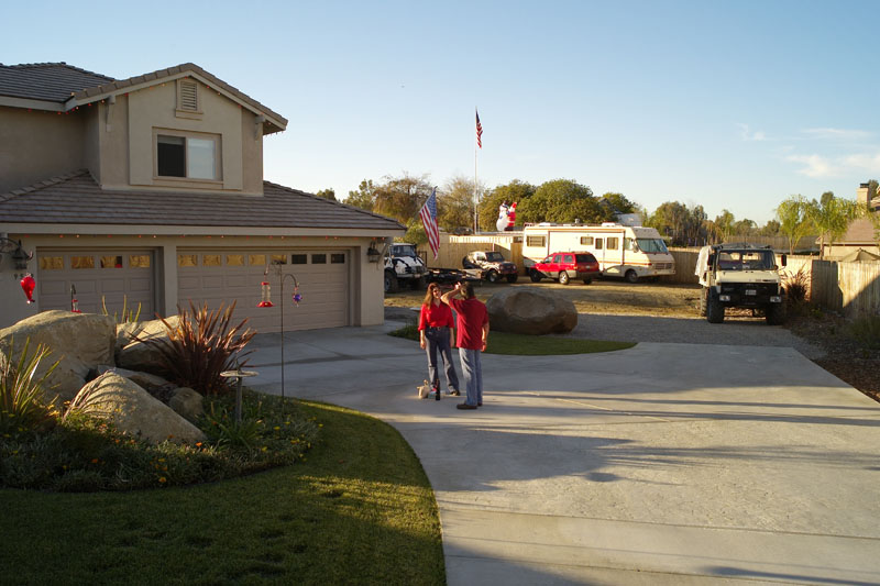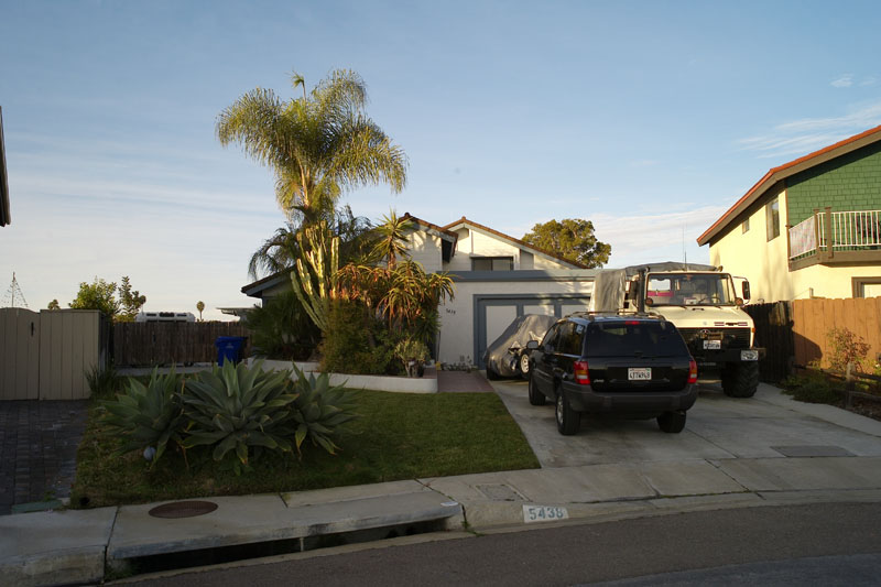 My best friend Kai Serrano moved to Santee and got this really nice place with a really big lot. There is plenty of room here for him to do "wrenching" on his trucks. Here, Kathleen catches up with Kai. Note the large parking area to the right of the house.