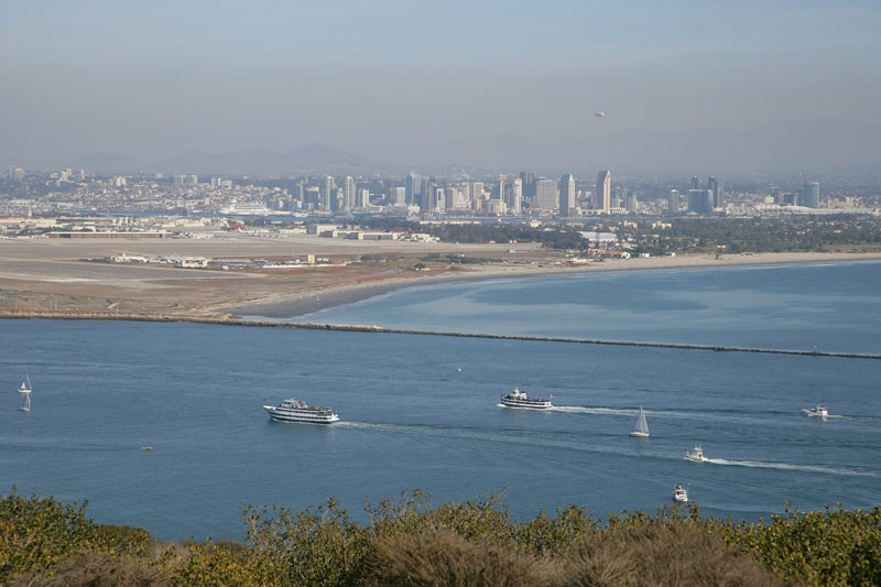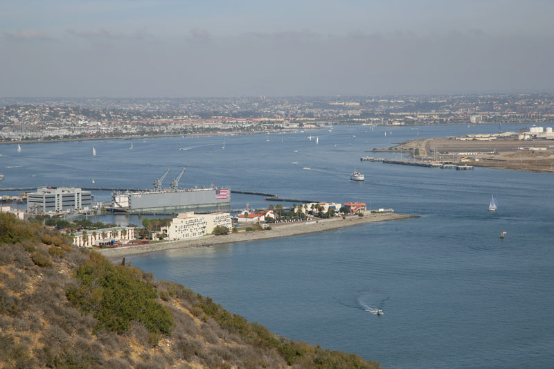 The view from Point Loma is awesome. This is looking to the east toward San Diego Bay. Note the quantity of boat traffic. The object in the foreground is a floating drydock for submarines at the Ballast Point Submarine Station.