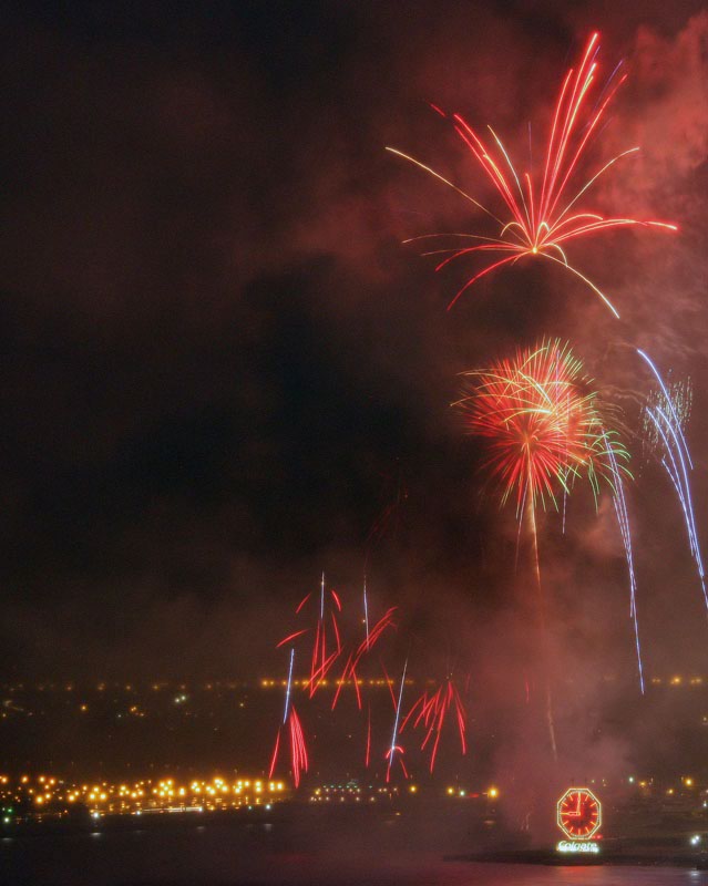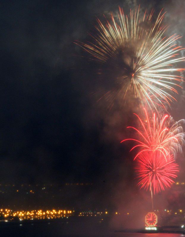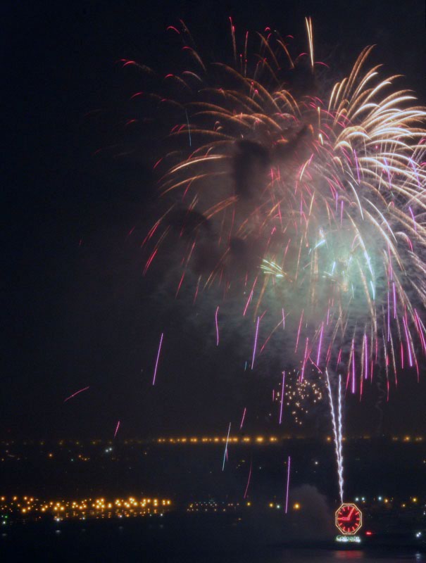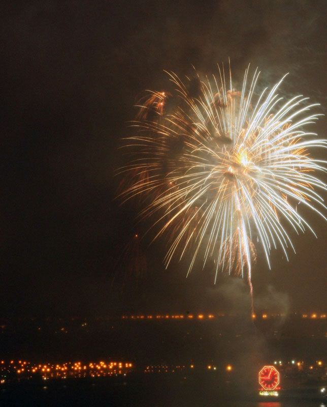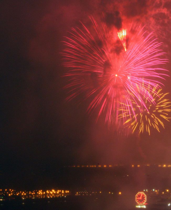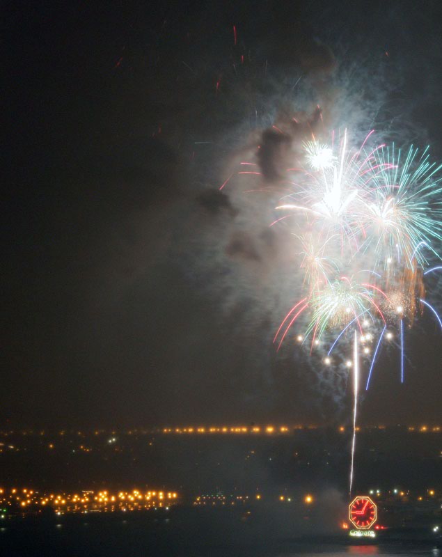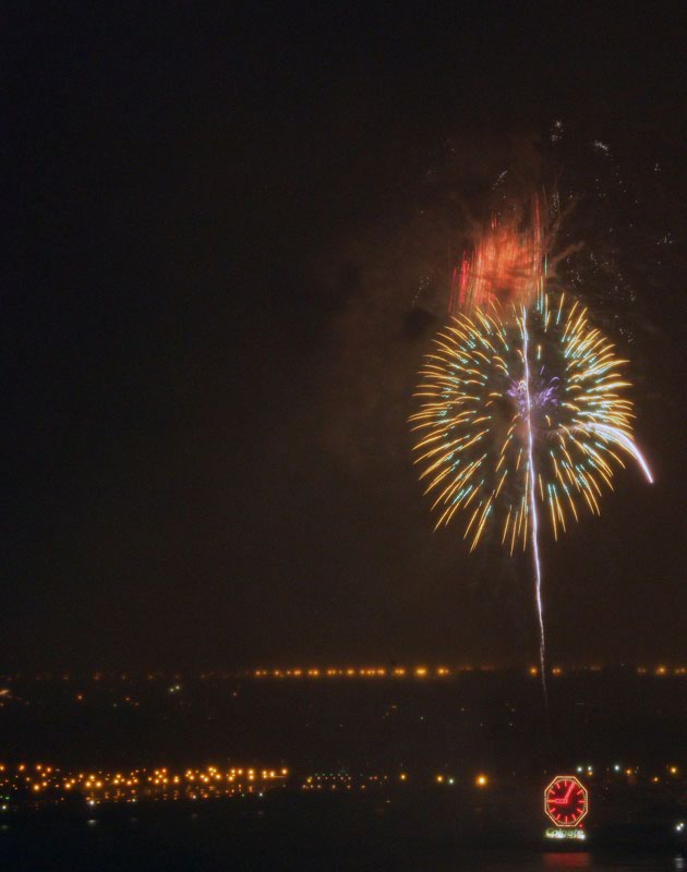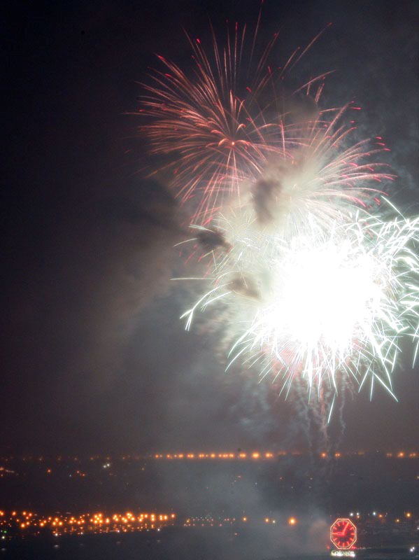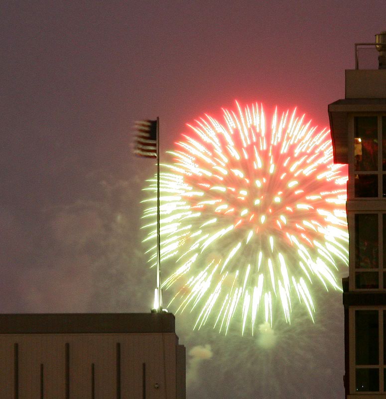 We finished a nice day about the town and came back to the apartment to watch a video. I noticed lights out of the side window and was suprised to see fireworks. So, I grabbed the camera (which was already on a tripod) and pointed it at the show. It was dark and I had to put the lens on manual focus, so the combination of the smoke from the fireworks and the soft focus gave a surreal effect. All of these photos were taken with my Canon 1Ds Mark II with a 28-300mm lens. Exposure times were manual (bulb) and ranged from 2 seconds to more than 6 seconds.