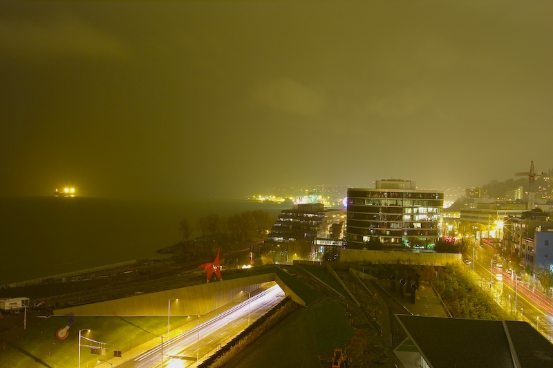 A slightly over exposed shot of pier 70 across the street from our apartment. Note the illumination in the air that is a result of the street lights interacting with the fog. The streets are slick with rain, reflecting the sodium yellow steet lights. Alki beach and west Seattle are visible in the distance. This was a 24 second exposure with automatic noise reduction.
