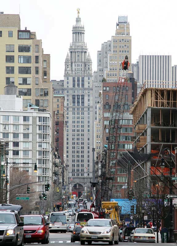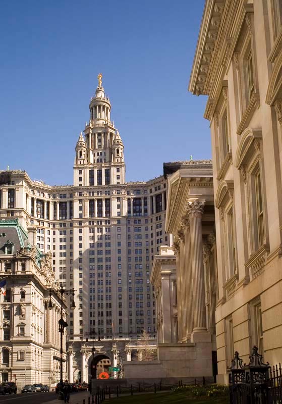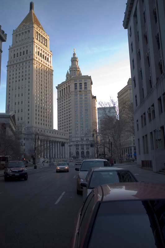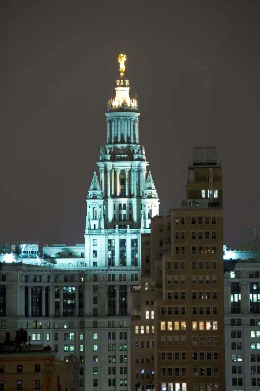 The City Hall building dominates the skyline, particularly at night. This shot is looking east at City Hall down Chambers Street.