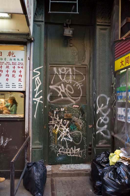 A door in Chinatown that is covered with graffitti. Plus the ever present black trash bags.