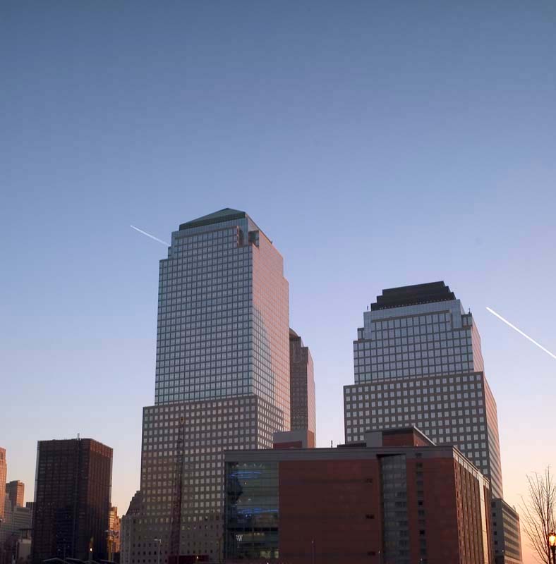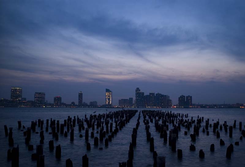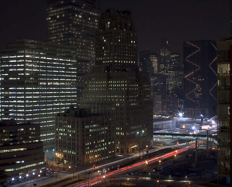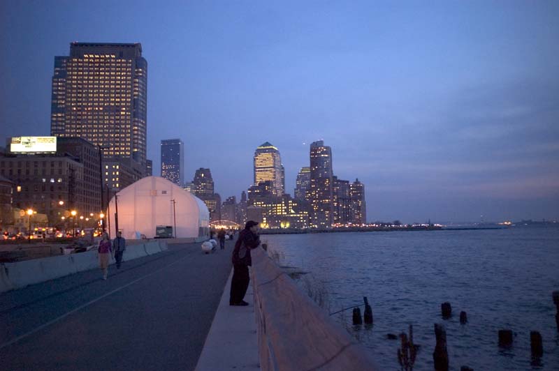 Pondering the river. Battery Park City is in the background. The Travelers Building is the big one on the left. The lighted structure to the left of the walkway is the NY Trapeze School.