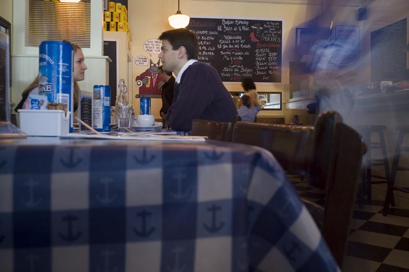 A zippy waiter leaves ghostly trails in the dimly lit cafe.