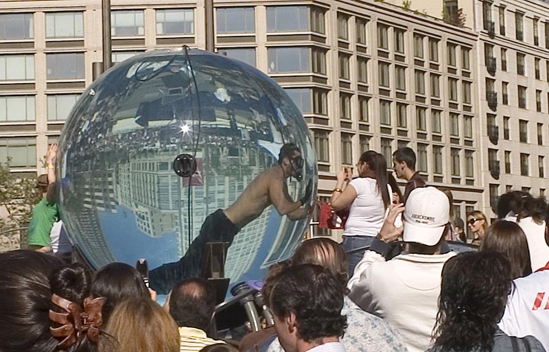 Here is David Blaine in the glass sphere. Note the lens effect of the buildings in the background.