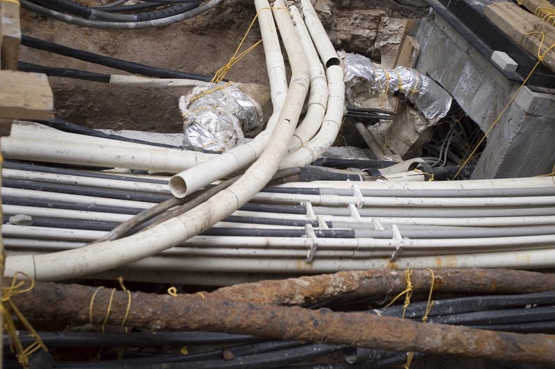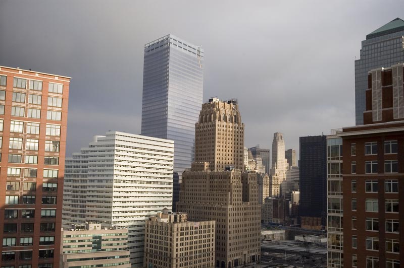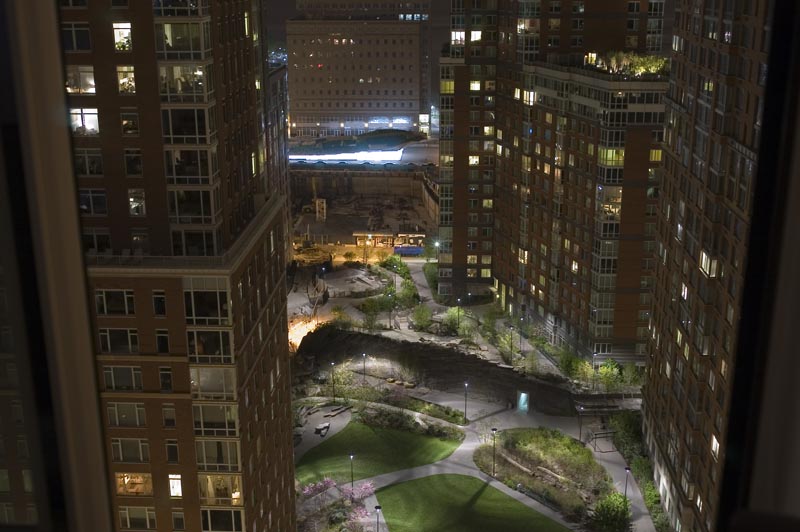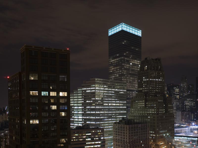 This is a view of the WTC crater (at the far right, lower corner), and close buildings. On left, the string of lights at an angle is the Brooklyn Bridge. The short building in the center with all the lights on is the Bank of New York. The tall building with the lights at the top is currently unidentified, but the building to its immediate right (to the left of the heavily illuminated crater area) is the Verizon building.