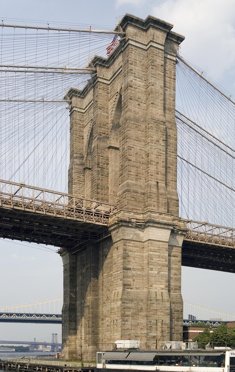One of the bridge towers of the Brooklyn Bridge on the Brooklyn side. Note the maze of guy wires. Note the other two bridges in the distance.