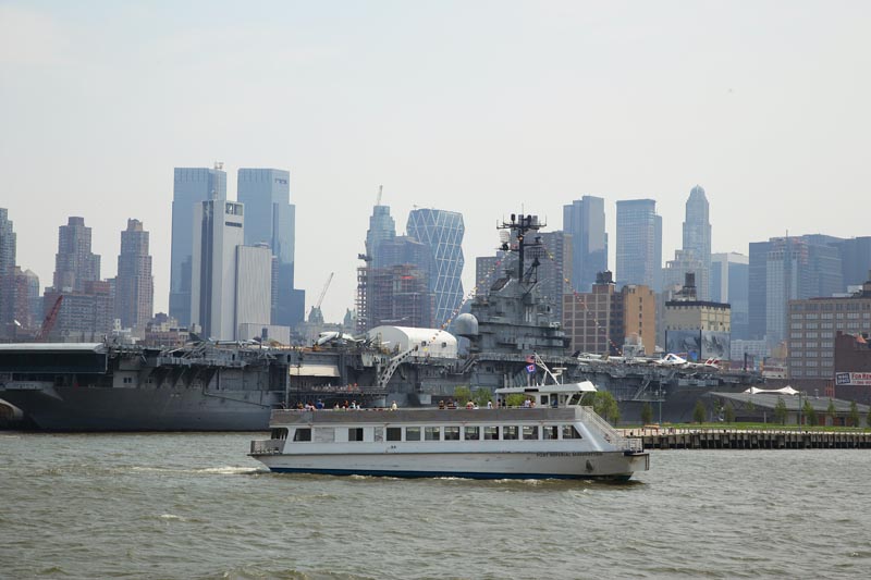 A view of one of the water taxis and the USS Intrepid, an aircraft carrier turned floating museum. Visible on the skyline is the odd shape of the Hearst Building.